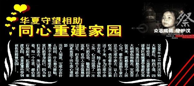 2008年5.12四川汶川特大地震后,陕西宁强、四川攀枝花、云南楚雄等西部地区相继遭受地震灾害,给当地的同胞造成了巨大的创伤和痛苦,灾害突如其来,震撼着每个人的心灵。很多无辜的生命在这次灾难中逝去,让人们叹息。也有很多人幸运地活了下来。作为灾难中的幸存者,除了身体的创伤之外,心灵也经受了一次巨大的浩劫。随着时间的流逝,有些人会坚强地挺过去,但是有些人可能会因此而留下终生的心理阴影.没有人知道,灾难会在什么时间、什么地方降临。那些不幸的罹难者,只是我们的替身而已,因为他们的离去,所以我们还活着。每一个生者,都必须行动起来:抗震救灾、重建家园,也重建那些受到创伤的精神家园