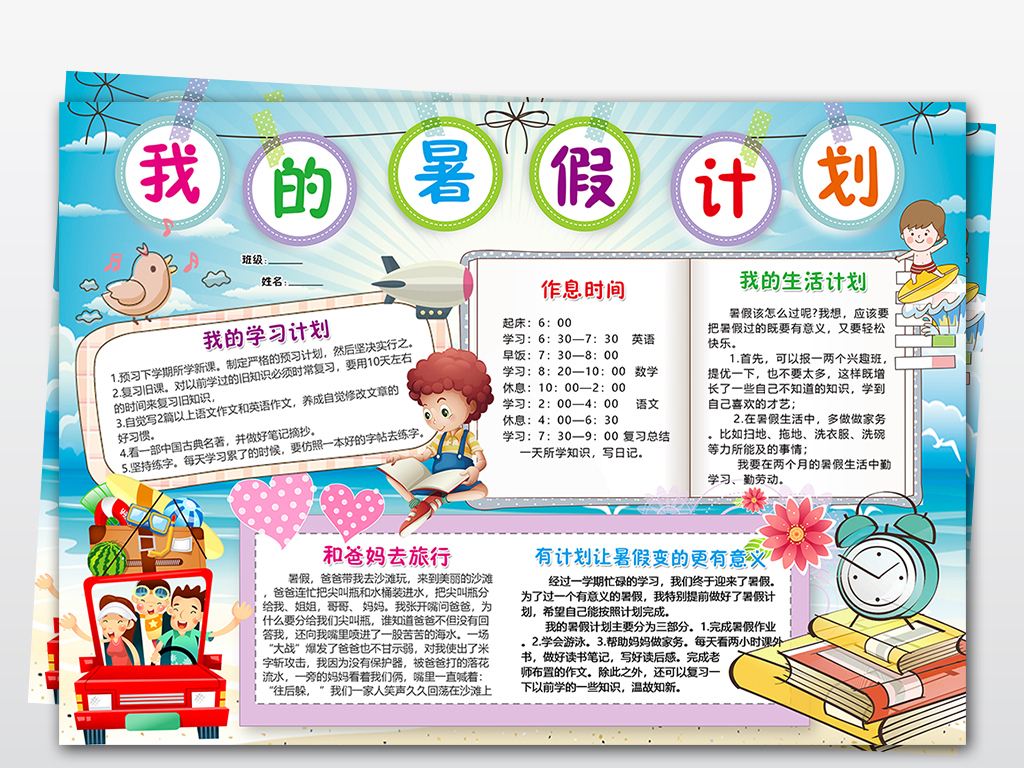 我的暑假计划,关于我暑假生活的安排的手抄报模板