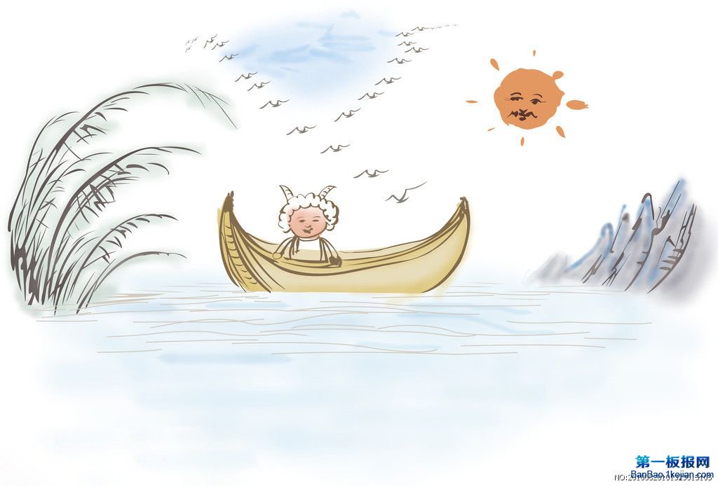 河中小船 移门 卡通 太阳 船 小孩 芦苇 山 鸟 其他设计 环境设计