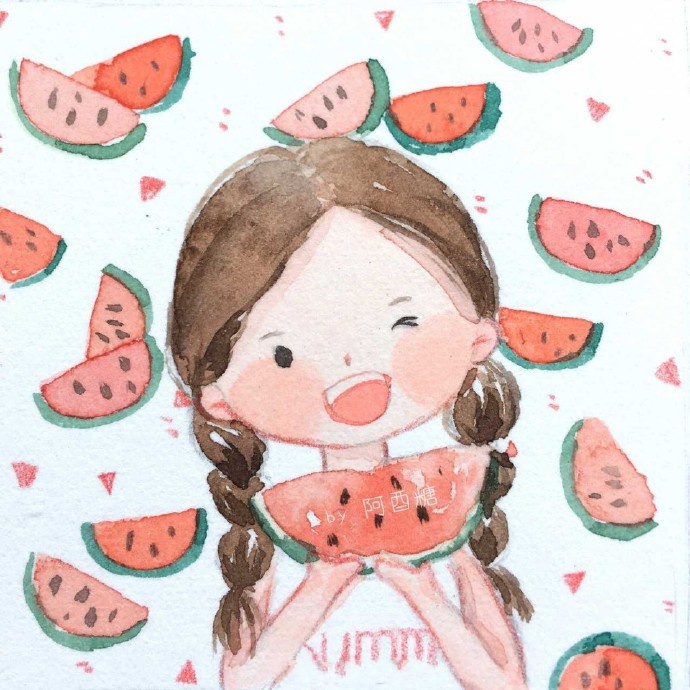 夏季清新清爽QQ微信头像,吃西瓜的女孩唯美水彩画头像