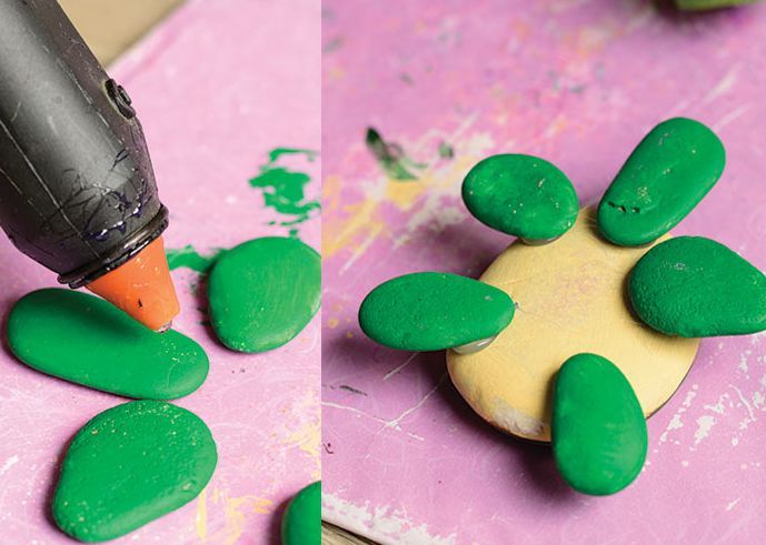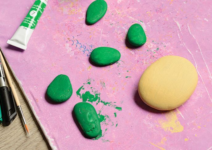 制作步骤:将石块洗干净,擦干水份,把5块小石头染成绿色,备用,制作过程中,可以在下面垫一张纸,防止弄脏桌面哦!