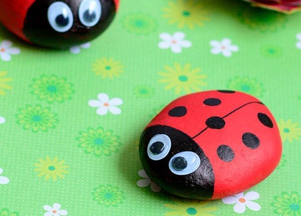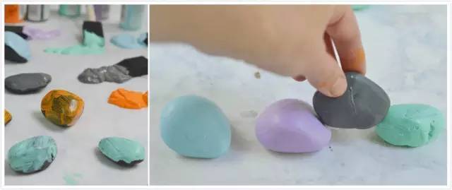 制作步骤:选择5块均匀大小的石头,涂上喜欢的彩色颜料,然后用胶水粘住~