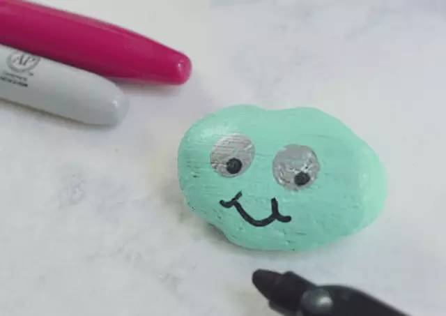 再选择一块扁扁的石头,当做头部,画上眼睛和嘴巴~