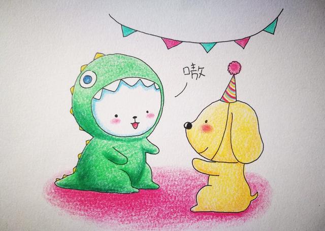 彩铅手绘,可爱的插画,猫和狗的幸福生活,节日快乐