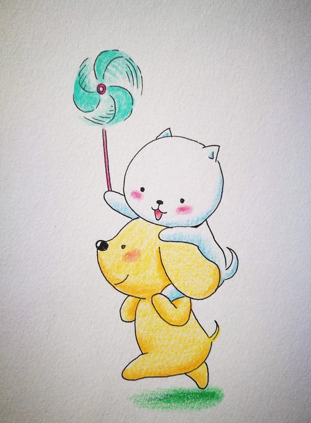 彩铅手绘,可爱的插画,猫和狗的幸福生活,骑大马