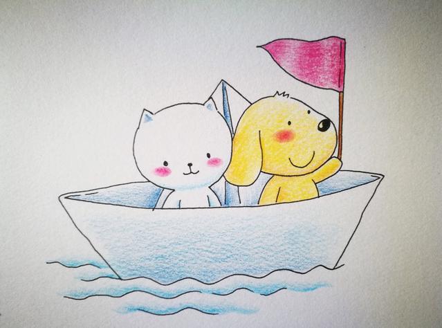 彩铅手绘,可爱的插画,猫和狗的幸福生活,乘船