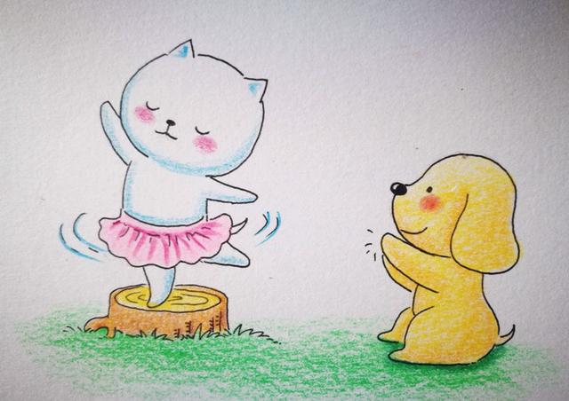 彩铅手绘,可爱的插画,猫和狗的幸福生活,跳舞