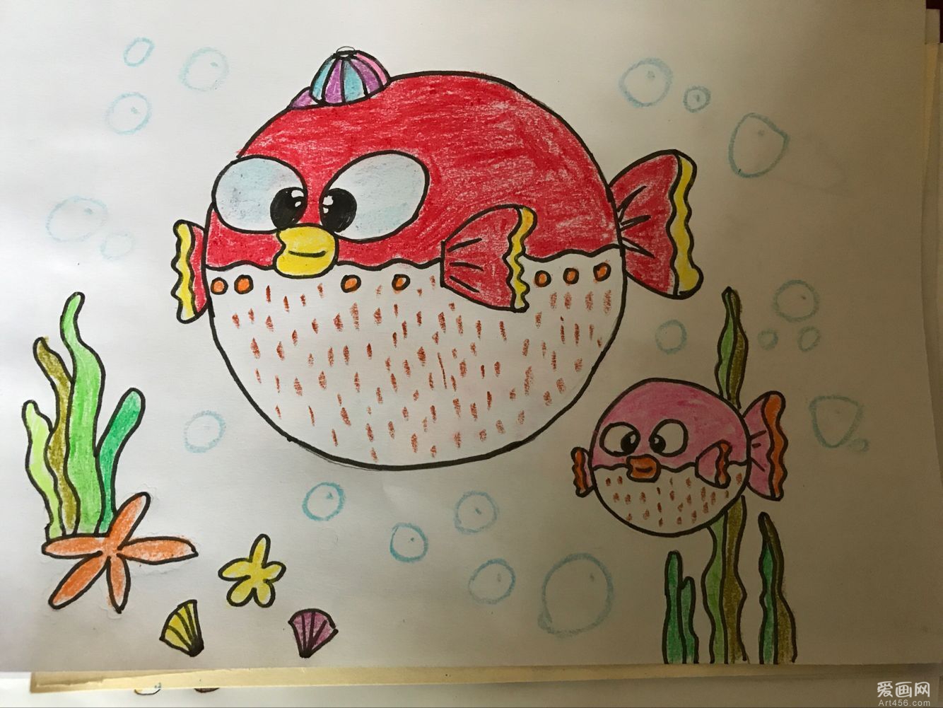 2只可爱的河豚鱼涂色蜡笔简笔画
