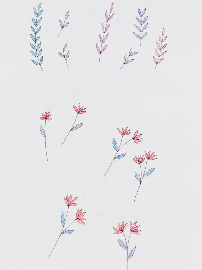 钢笔彩色涂色简洁树枝花朵手账手抄报花边素材画法