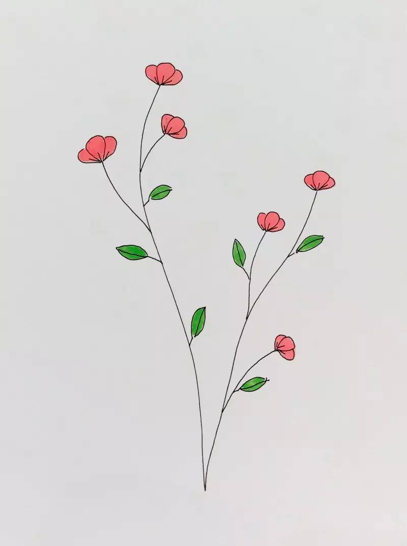 钢笔彩色涂色简洁树枝花朵手账手抄报花边素材画法
