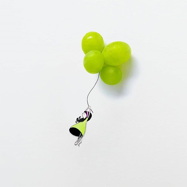 青葡萄装饰气球,拉气球的女孩创意简笔画手机背景图素材