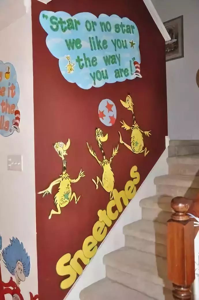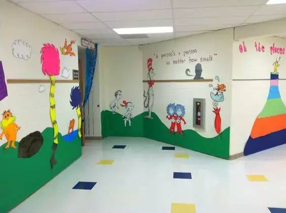 国内外有很多以绘本为主题的环创,将一学期要读的绘本融入到幼儿园的环境创设当中,走廊非常适合这种大型环创,把绘本中的宏大场景展现出来,让孩子们身临其境地学到更多知识。