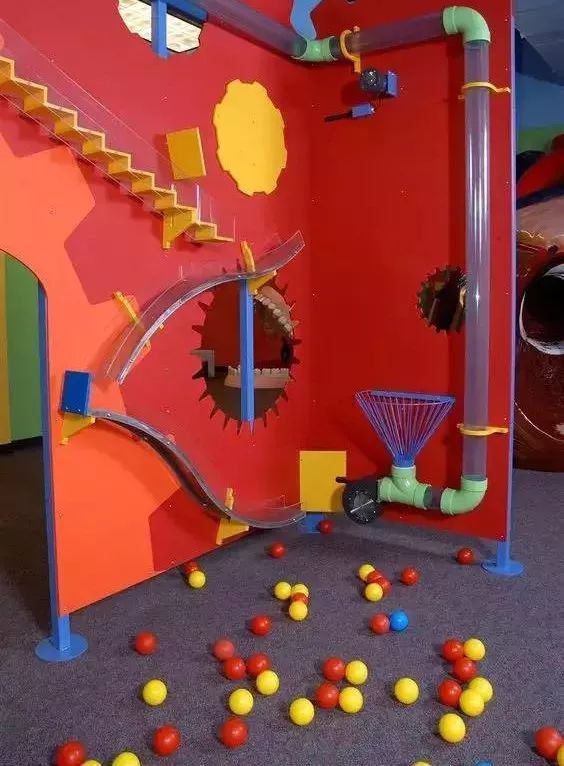 最好玩的还要数机械动力墙!在走廊的墙上安放一些管子、滑道、滑轮,孩子们可以从小球滑落的过程中接触初级的物理知识。