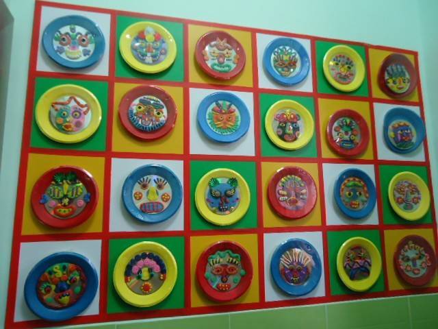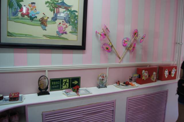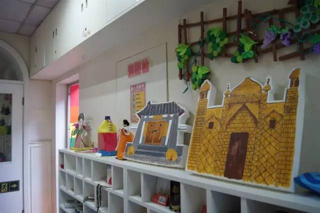除了墙面展览,还可以在空间较为宽阔的地方设置一个展台,陈列孩子们的手工作品。