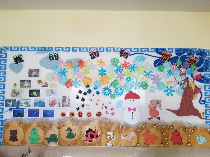 主题墙围绕动物,在墙面上布置动物照片,由于是冬季所以在底部运用冬眠动物,请面试白色的底代表冬季,上方用剪纸雪花装饰大树,雪地里还有小动物的小脚印。