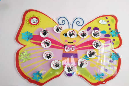 2、用食指蘸上红色丙烯颜料,在树枝适当的位置点画梅花。然后将剪好的雪花加以装饰。