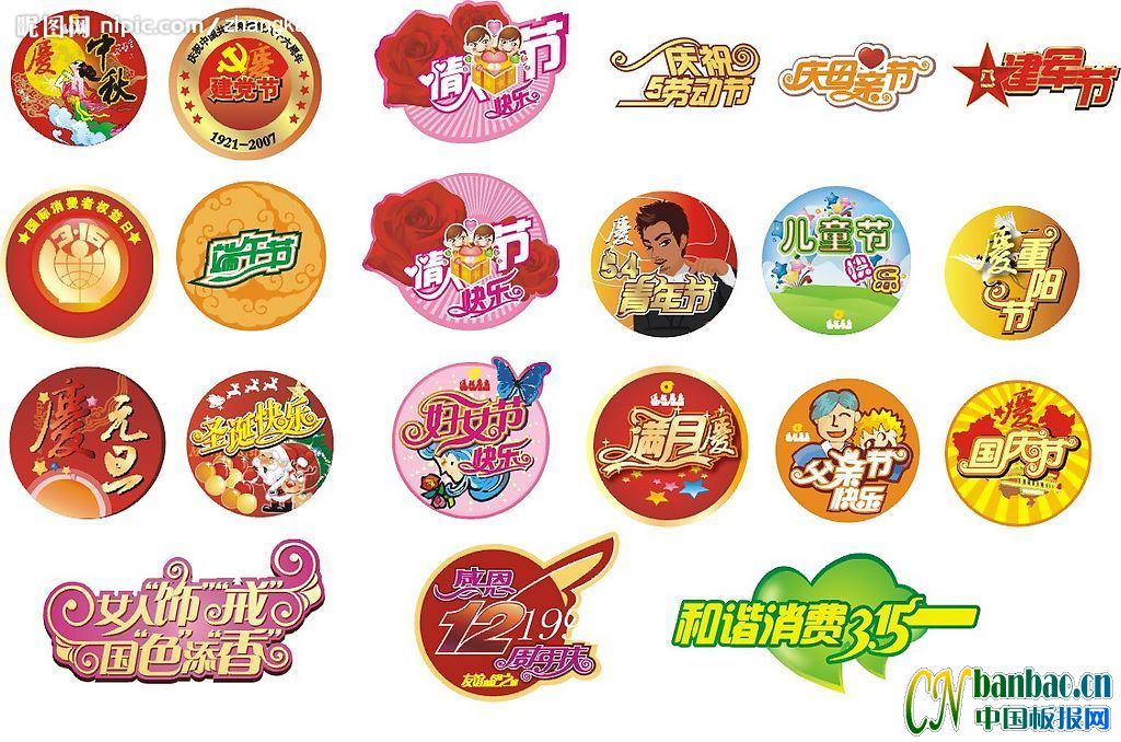 包含中秋节、建党节、情人节、劳动节、母亲节、建军节、青年节、端午节、重阳节、国庆节、元旦节、妇女节、圣诞节、儿童节、消费者权益日等众多节日的主题美术字体和标识