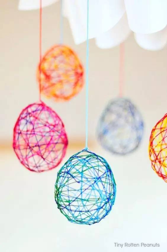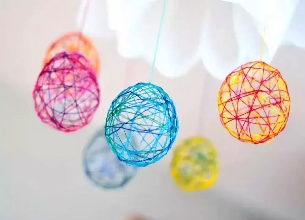 制作步骤:先吹一个小气球,毛线粘上固定形状的胶水或浆料后缠绕在小气球上,剩下的就是一个等毛线干的过程。