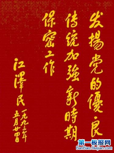 这是江泽民同志1993年为纪念《保密法》颁布五周年的题词:发扬党的优良传统,加强新时期保密工作。