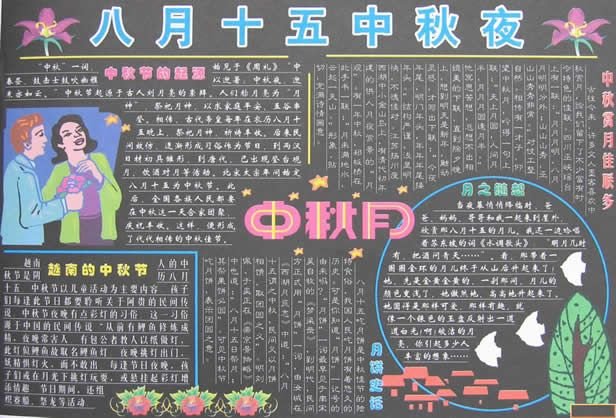 这幅中秋节黑板报排版设计美观,色彩搭配靓丽,特别是内容选取丰富,书写工整,值得学习。