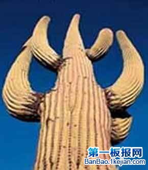 在墨西哥沙漠中有一仙人掌,它高21米,直径的30-60厘米,重有10吨左右,被称为“沙瓜洛仙掌”。仙人掌的茎是圆柱形,上有12-20条隆起的纵助,在茎上部有烛台似的分枝,开蜡质白色的花朵,结结红色可食的果实。