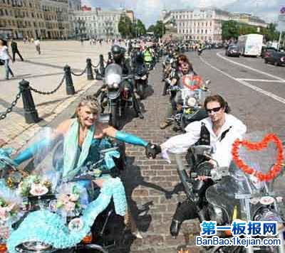 2008年7月5日,在乌克兰首都基辅市中心,新娘加林娜格兰(前左)和新郎叶夫根尼欧克维奇(前右)带领一支数千名骑手组成的摩托婚车队在街头庆祝。这对新婚夫妇希望他们的摩托婚车队能够打破一项吉尼斯世界纪录。