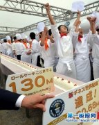 2013年4月17日,在日本东京,合力完成超长夹心蛋糕卷的糕点师们挥手庆祝。这个超长夹心蛋糕卷全长130.68米,共使用了54公斤面粉、43公斤糖和2682个鸡蛋,由约90名糕点师共同制作完成...