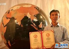 2013年10月17日,城东街道岩下村村民蔡胜利,正拿着世界纪录协会颁发的证书和自己制作的巨型地球仪合影。 2004年至2012年,蔡师傅打造了这个直径1.4米、重达960千克、 世界上最大的花...