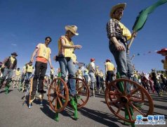 2009年6月16日,加拿大蒙特利尔,人们参加太阳马戏团举办的踩高跷活动,以创立最多人同时踩高跷新的吉尼斯世界纪录。...