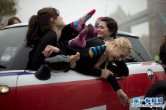 2012年11月15日,在英国首都伦敦,参加活动的女选手们在成功打破一辆MINI车里装进最多人的吉尼斯记录后为记者摆姿势拍照。当天,28名女性成功挤进了一辆MINI车,打破了此前挤进27人的...