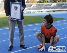 2012年11月15日,在日本东京,30岁的伊藤健一(右)蹲坐在自己的世界纪录纪念证书旁。伊藤健一是“ 世界上用四肢跑得最快的人 ”,他手脚并用,100米跑出了17.47秒的成绩。...