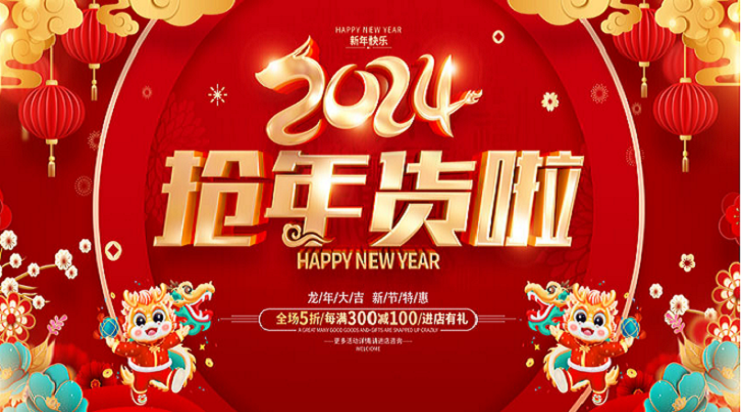 2024龙年节日展板素材、电子展板设计图:2024抢年货啦!