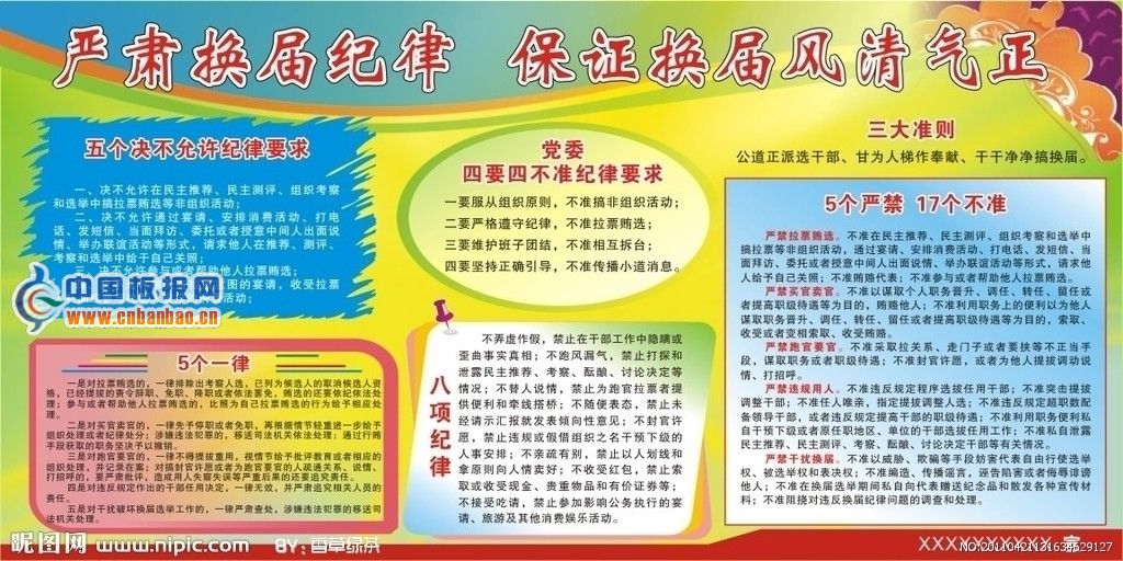 五个绝不允许纪律要求 党委四要四不准纪律要求 5个一律 八项纪律 党委政府换届板报 5个严禁 社区换届选举板报 三大准则 党委换届板报 5个严禁 17个不准 换届大会