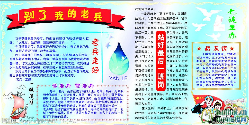 退伍板报 退伍 转业 清爽底图 老兵 帆船 一帆风顺 花边 军人 军徽 部队 鸽子 信封 丝带 眼泪 广告设计 矢量 CDR