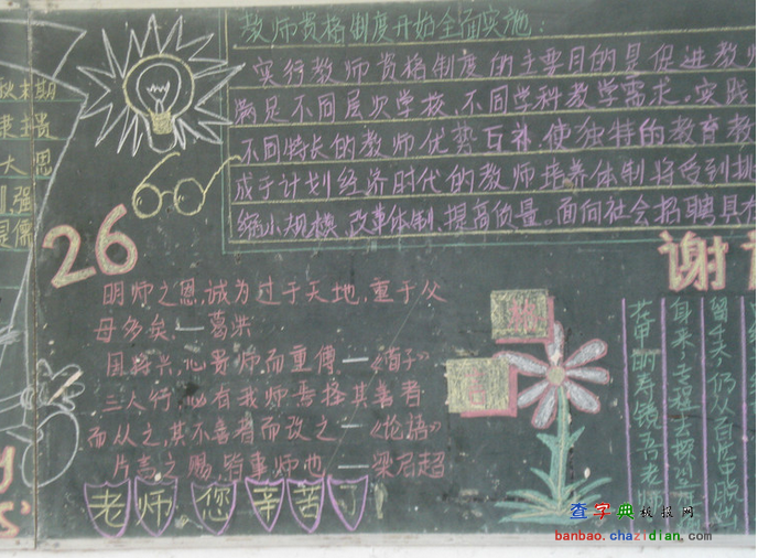 “春蚕到死丝方尽蜡炬成灰泪始干。”老师就像春蚕只为他人服务却丝毫不求任何回报也从无怨言还是认认真真地为人服务。在这个属于老师们的节日里,让我们献上一副教师节黑板报祝愿我们的老师节日快乐