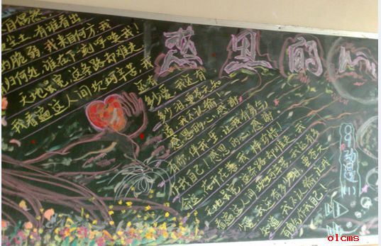 这次黑板报的主题是“感恩” ,为了体现这一主题,我们画了很多个爱心在里面,给人一看就知道是关于这个主题的,整体上给人一种暖暖的感觉,因为感恩别人,别人是会感到温暖的,然后我们还做了许多个边框体现这一主题。文章上,我们选了很多有教育意义的文章,号召大家要学会感恩。