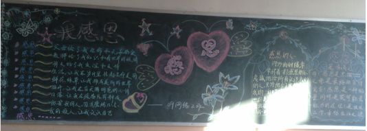 这次黑板报的主题是“感恩”,我们为了体现这个主题,他地设计了爱心边框,我们板报的左右两边分别画了很多个粉红色的爱心,一目了然。心的旁边还写了一个 爱心 ,感恩,首先要有一颗爱心,一颗爱人的心,所以我们这样设计,我们还用不同颜色的笔抄写了文字素材,这样会给整体的颜色带来不同效果。