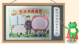 首先在手抄报的上方写出主题宪法伴我成长,在手抄报底部画上三位举着旗帜的小朋友,在手抄报的中间画上一位法官,在法官的左右两侧画三个边框,给主题涂上红色,人物也都涂上颜色,最后涂上背景色,宪法伴我成长手抄报就完成啦。