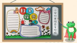 先画出报头,往下画出小偷和警示灯,再画出一个文框出来,在左右两侧各画出一个文框后,底部画上草丛,在文框中画出文字栏,小学扫黑除恶手抄报将报头填上不同颜色,警示灯涂上红色,将小偷、草丛和边框线涂好颜色,扫黑除恶手抄报就完成了。