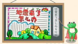 先画报头,底部画出小山坡、小树与开裂的房屋,补充画出小树与开裂地面后,往上画出边框,地面涂绿,小树涂成绿黄两色,边框也用彩色涂好,报头涂红,房子与开裂地面也涂好颜色,最后画出文字栏,地震来了怎么办手抄报就画好啦。