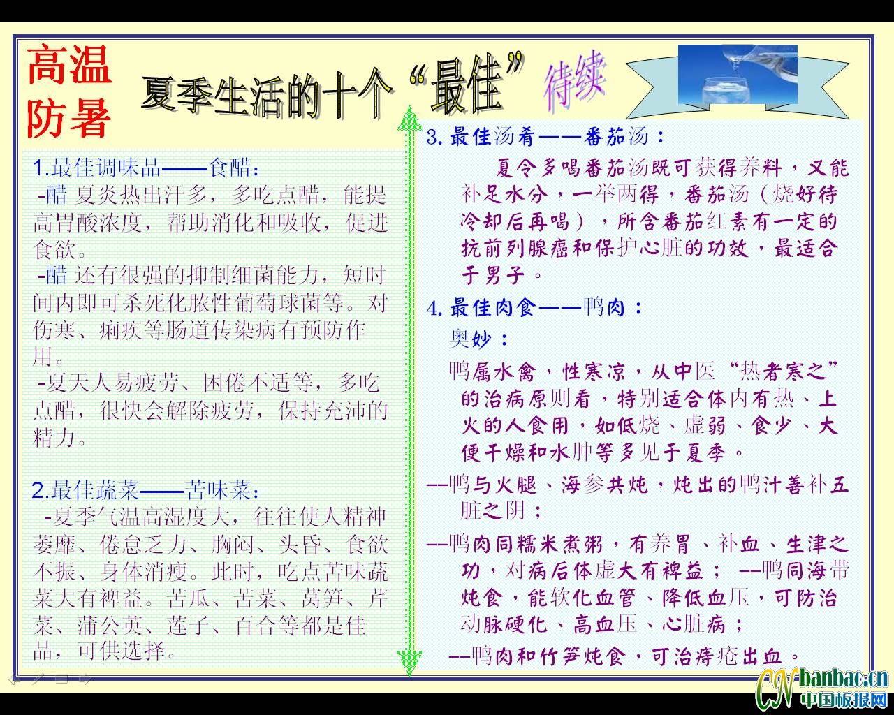 -醋 夏炎热出汗多,多吃点醋,能提高胃酸浓度,帮助消化和吸收,促进食欲。