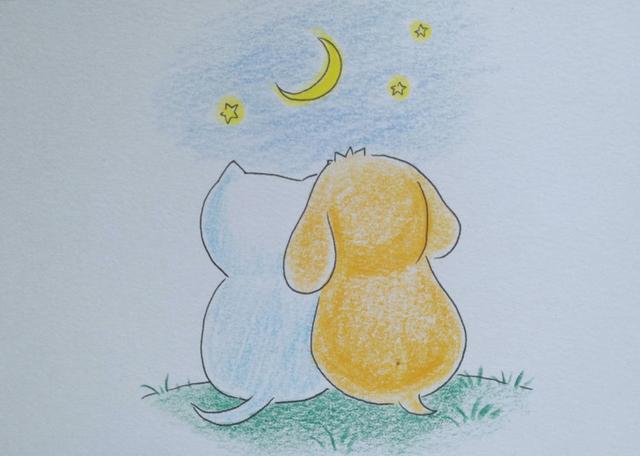 小猫和小狗依偎在一起看星星的可爱简笔画