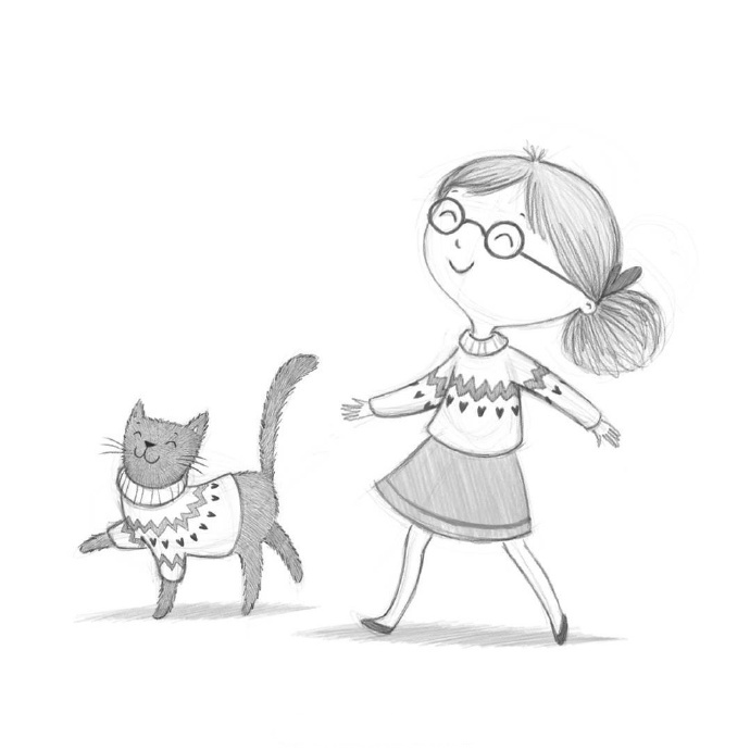 小女孩和她可爱的猫咪悠闲地散步萌版动物铅笔简笔画