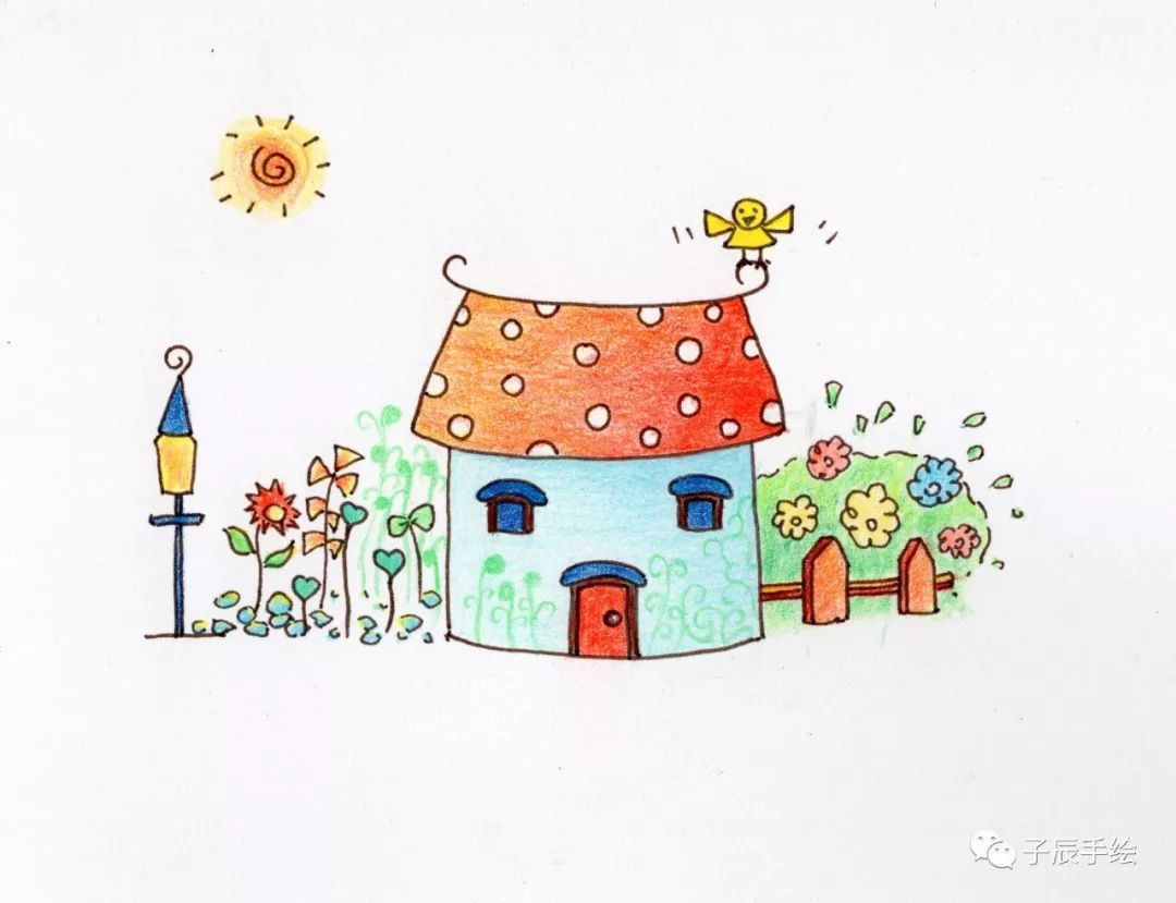 炊烟袅袅,蘑菇顶小房子卡通简笔画