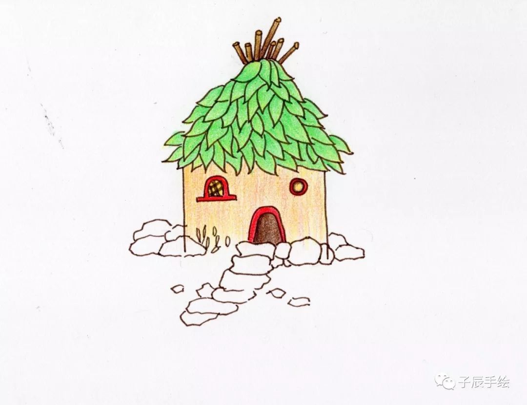 炊烟袅袅,蘑菇顶小房子卡通简笔画
