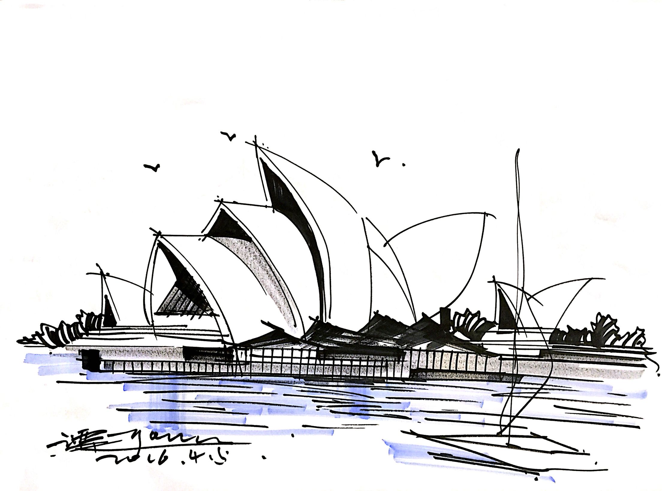 世界名建筑,悉尼大剧院钢笔线条简笔画