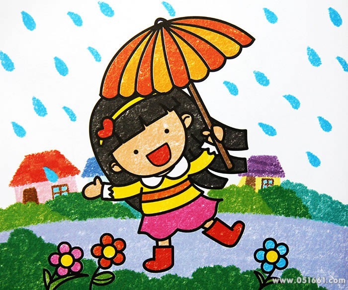 小女孩打着伞在雨中玩耍的简笔画
