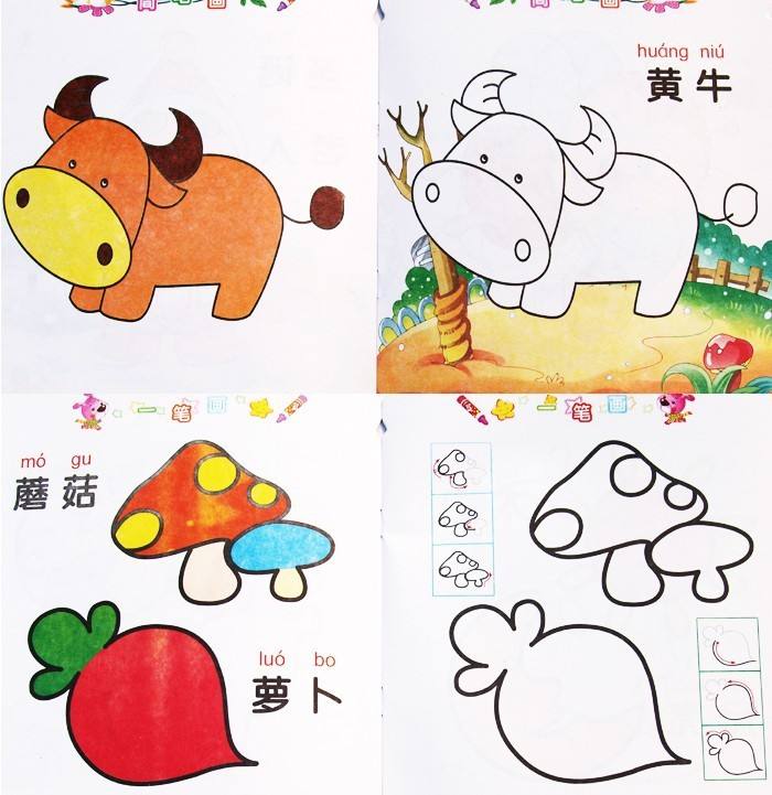 儿童简笔画,彩色涂色简笔画,黄牛,萝卜,蘑菇简笔画