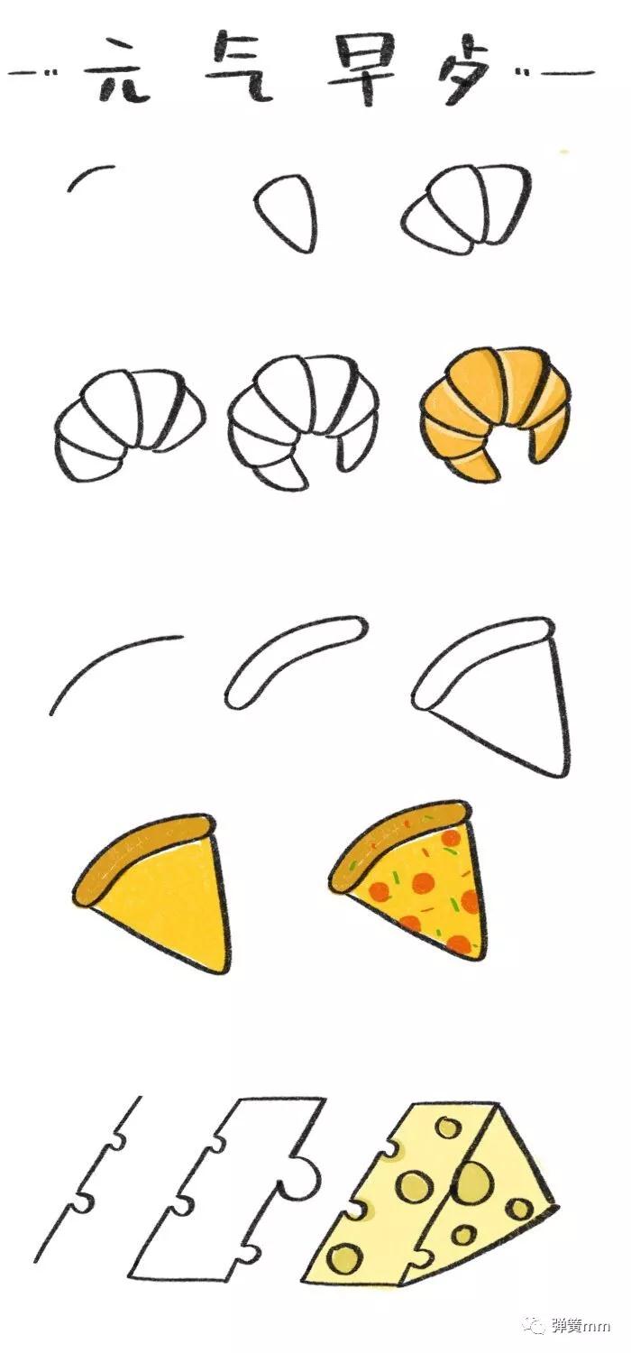 元气早餐的简单画法,牛角包,奶酪,披萨的简笔画教程