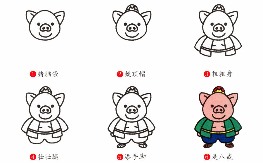 西游记人物简笔画,二师兄猪八戒简笔画画法教程
